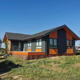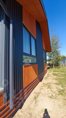 Фасадная часть дома отделана матовым проф.листом Сатин GRАNDLINЕ толщиной 0.5 мм. и планкеном.
