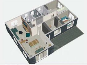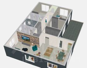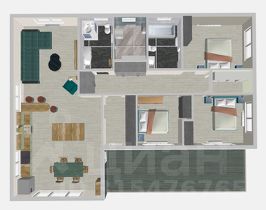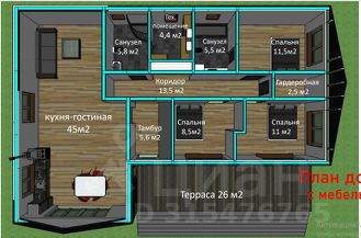 3 спальни, кухня-столовая-гостиная, 2 санузла, техническое помещение, холл и гардеробная.