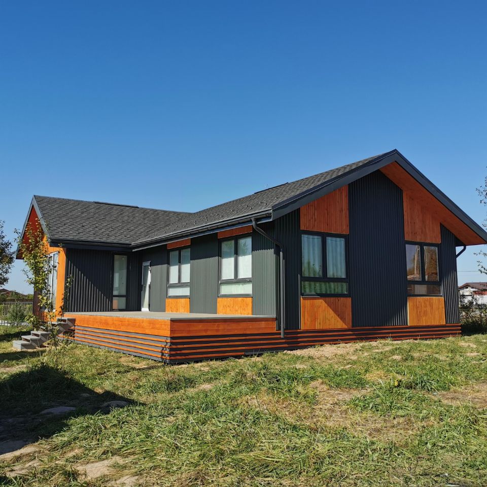 Современный Каркасный дом в финском стиле площадью 143 кв.м включая летнюю террасу 26 кв.м (общая площадь всех комнат- 117 кв.м) расположен на участке 12 соток ИЖС