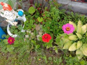 На участке растут плодовые деревья: яблони, вишни, слива и кустарники: малина, крыжовник, смородина, жимолость, ежевика. Много многолетних цветов: розы, ирисы, пионы, гортензия, лилии, лилейник, хоста и т.д.