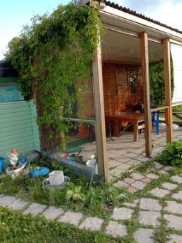 На участке теплица, хозблок (2 х 5) с пристроенной беседкой и летним душем.