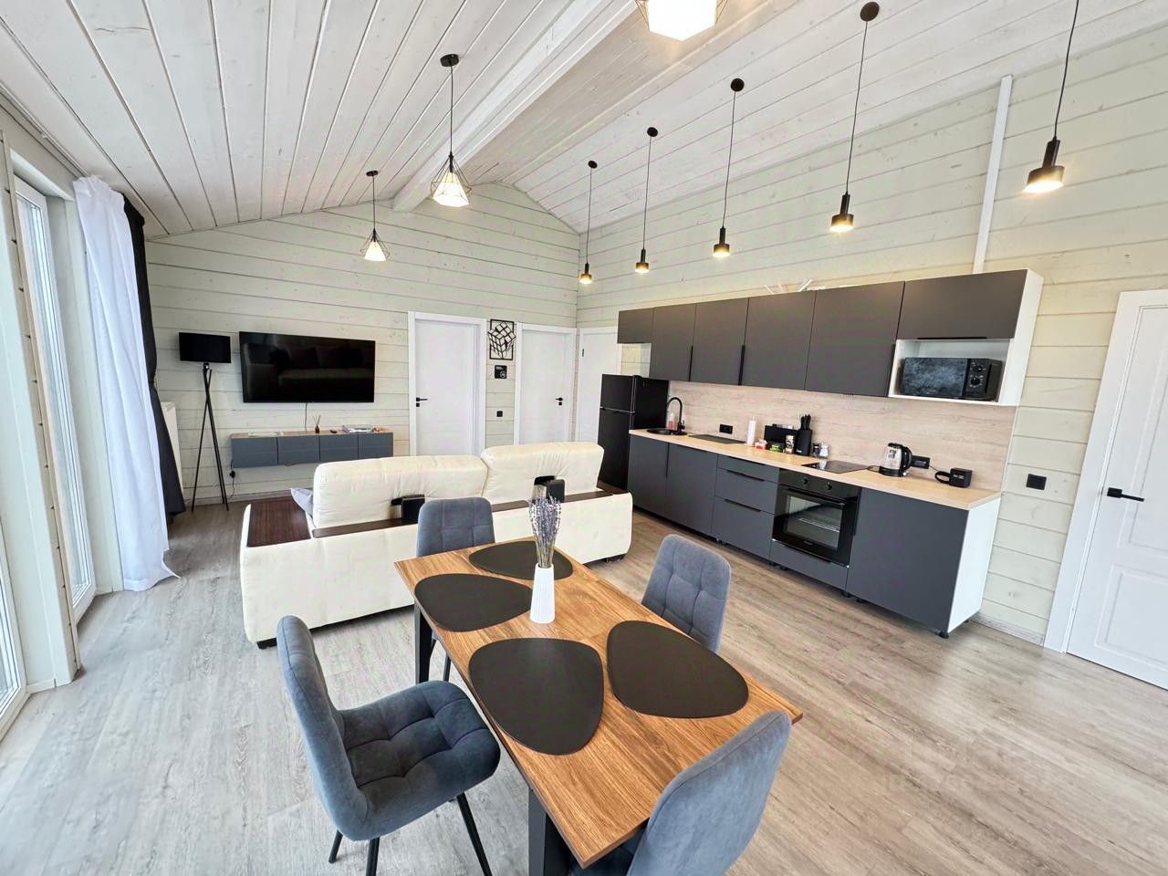 Панорамные oкна создaют проcторнoe и светлoe проcтpанcтво, а количество комнат позволит разместить всю семью с комфортом.