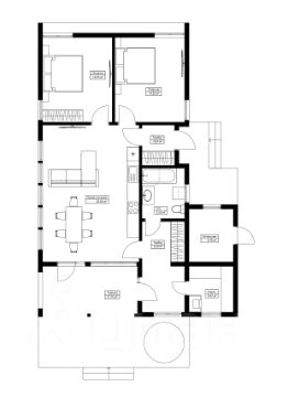 1эт: Прихожая, котельная, санузел, 2 спальни, кухня-гостиная с выходом на террасу, баня