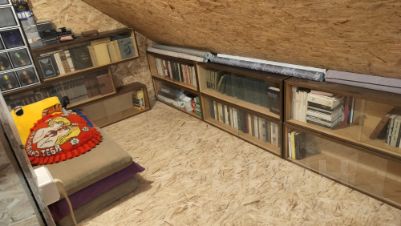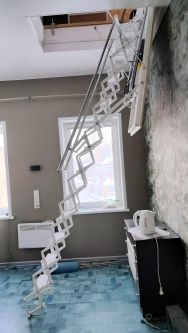 Гараж с автоматическими воротами с выходом в дом. Есть большая мансарда (47 метров). На нее ведет автоматическая лестница. На мансарде есть освещение, розетки. Выведены вода и канализация (не подключены, но оборудование стоит рядом).