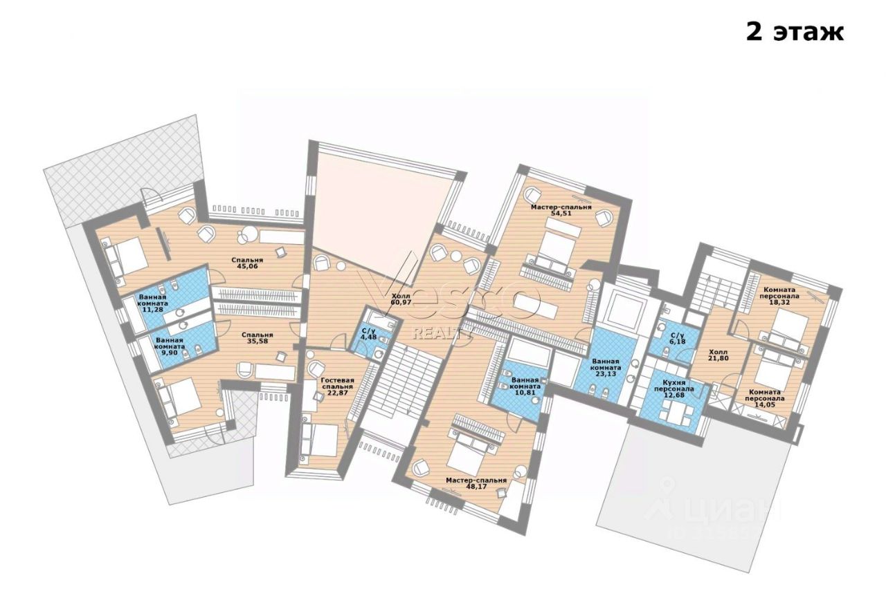 Гостевая спальня (22,9) с с/у (4,5), лестничный холл (60,1).