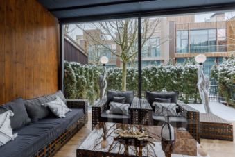 Эксплуатируемая кровля-терраса приватная зона отдыха с лаунж-пространством, покрытая декингом и оборудованная под солнечный солярий с великолепными видами.