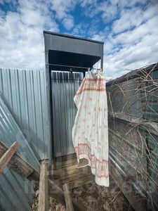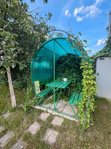 На участке расположен летний домик. Два этажа: первый этаже небольшая комната-кухня (ок. 7 кв. м), уборная (биотуалет), лестница на второй этаж. На втором этаже комната-спальня (ок. 7 кв. м), выход на небольшой балкончик. Из коммуникаций: свет, вода (скважина на глубину 38м.). Также есть биотуалет на улице, летний душ, мангальная зона, цветник, отсыпано щебнем парковочное место на две машины.