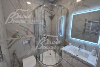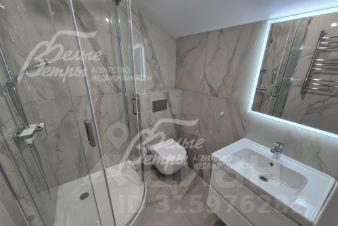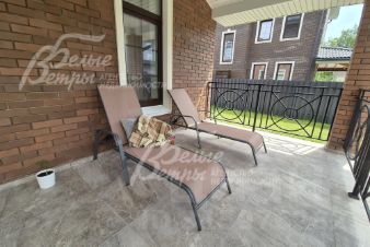 В санузлах - плитка Декор Porcelanosa Berna Deco Berna, мозаика Porcelanosa Berna Mosaico Berna Acero, краска интерьерная. Полы: гостиная-кухня - Керамогранит (Kerama marazzi МОНТЕ ТИБЕРИО ОБРЕЗНОЙ), с водяным подогревом. Спальни и кабинет - Кварц-виниловое покрытие под дерево, рисунок ""французская ёлка"", с водяным подогревом. Санузлы - Керамогранит Porcelanosa Berna Acero, с водяным подогревом. Лестничный марш: ж/б монолит ширина 0,95 м, ступени керамогранит, шаг 27Х16,7 см, ограждения - стеклянные с металлическими хромированными перилами. Потолки: подвесные ГКЛ с нишами под скрытые карнизы и освещение, с различной подсветкой. Сантехника вся установлена: ванны - Art&Max