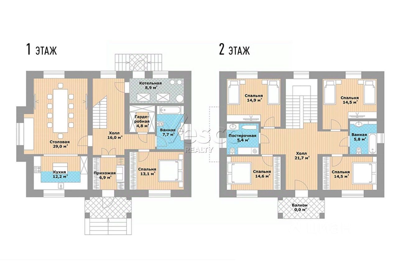 2 этаж: холл (21,7), 4 спальни (14,6, 14,5, 14,9 и 14,5), постирочная (5,4), ванная (5,8), балкон.