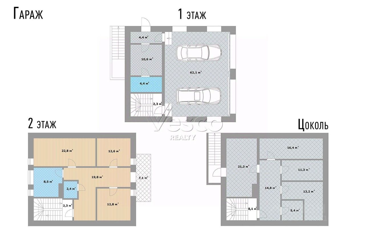 Комната водителя, 2 спальни, кухня-столовая, 2 с/у, цоколь для хранения (5 помещений), 2 гаража-мойки.