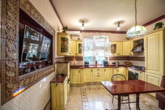Гостевой домик 180 кв. м: первый этаж из кирпича баня на дровах с 2-мя комнатами отдыха, парной и душевой, второй этаж из рубленного бревна (две однокомнатных квартиры) и мансарда. Баня и гостевая квартира меблированы в деревенском стиле.