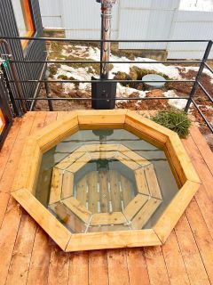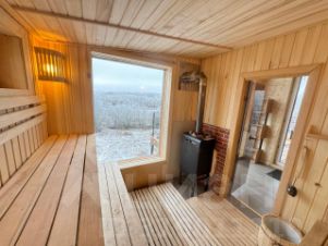 Планировка дома включает в себя просторную оборудованную кухню-гостинную с панорамным остеклением и выходом на большую террасу, откуда можно наслаждаться прекрасными панорамными видами на город, 2 спальни, совмещенный сан узел, котельную и баню. Установлен подогреваемый уличный чан.