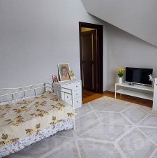 Первый этаж: большая гостинная с выходом просторную и уютную веранду, кухня с гарнитуром из массива и всей необходимой для жизни встроенной техникой, просторный санузел: ванная с гидромассажем и туалет, гостевой отдельный туалет, коридор.