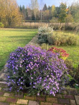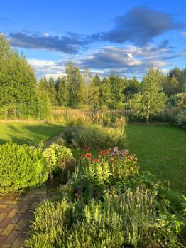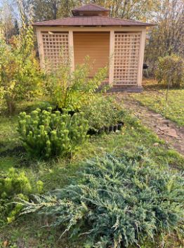 Гармонично оформленная территория с соснами, туями, декоративными кустарниками, цветущими растениями и деревьями.