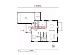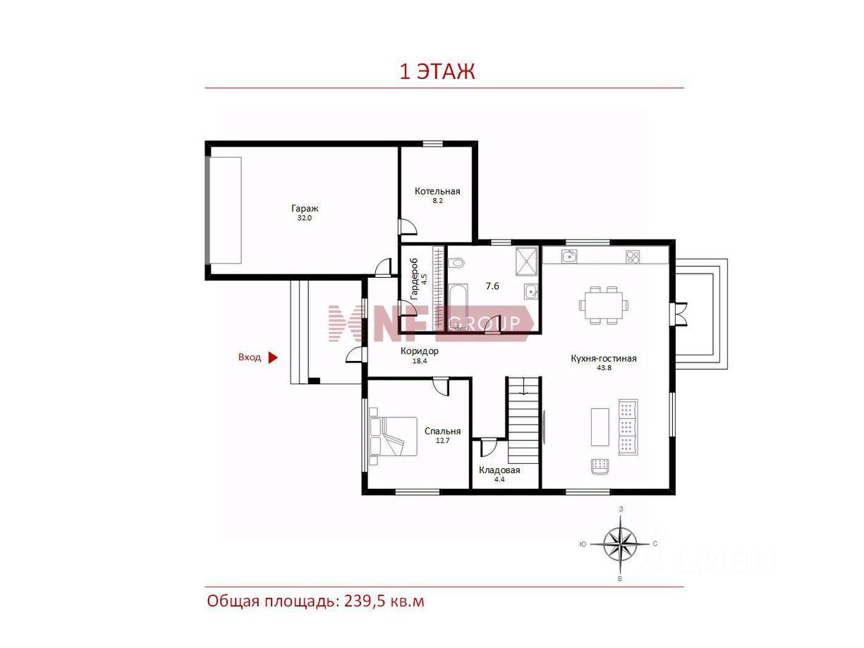 Кухня и гостиная 43,7 м2, гостевая спальня 12,7 м2, коридор 18,4 м2, гардероб 4,5 м2, кладовая 4,5 м2, су 7,5 м2, котельная 8,23 м2, гараж 31, 96 м2