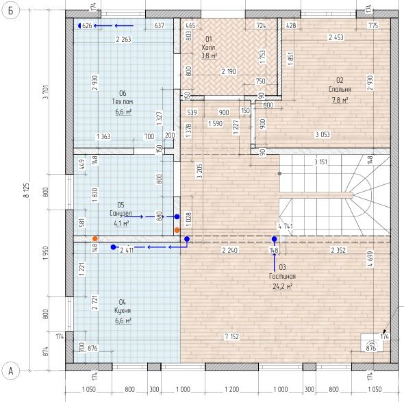 На 1м этаже: кухня-гостиная (30 м2), гостевая спальня (8 м2), техническо-складское помещение (7м2), санузел (4,5 м2);