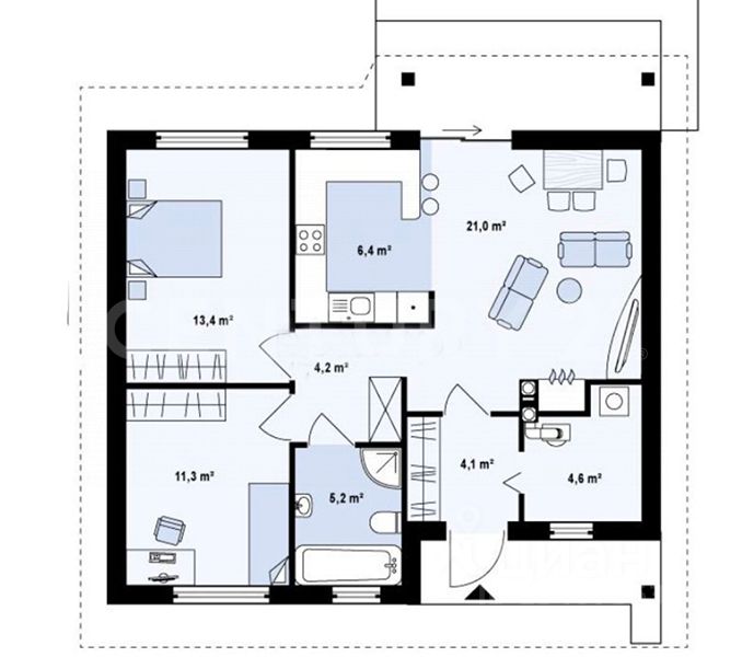 Планировкой предусмотрены: 2 спальни, просторная совмещенная кухня-гостиная, 2 сан. узла, котельная, терраса.