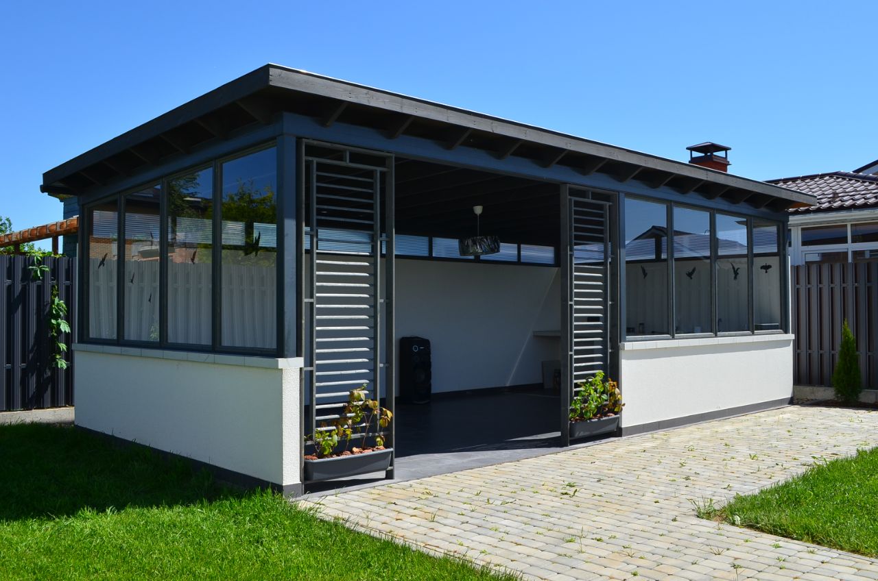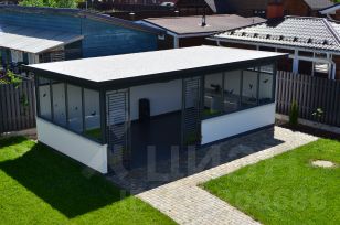 При въезде автонавес для двух машин с хозблоком общей площадью 54 м.кв. , оборудованный воротами , калитки и дверьми с эл.приводами (ALUTECH).