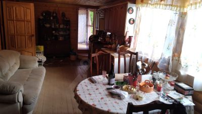 Если проехать из Москвы по Минскому шоссе примерно 70 км и свернуть у Дорохово налево, то можно доехать до деревни Петрищево, где расположен музей Зои Космодемьянской. В 3-х км от этой деревни рядом с лесным массивом и располагается СНТ Лесянка. Участок с домом находятся как бы в стороне от основного СНТ, не доезжая до речки. Сразу через дорогу от дома начинается лес. Участок огорожен металлическим штакетником на бетонном основании. Одни ворота выдвижные. Вторые ворота обычные, служат для заезда строительной техники. Дом деревянный. Первый этаж бревенчатый сруб 66, к нему пристроена комната из бруса 36 и веранда 39. Вход в дом со стороны веранды. Второй и третий этажи щитовые утеплённые. Крыша металлочерепица. Фундамент ленточный, высокий цоколь, подвал забетонирован, гидроизоляция. Дом получается 1010, навес 108. На первом этаже две раздельные комнаты, одна из них гостиная с камином. А также кухня и сан/узел. На втором этаже две комнаты с выходом на балкон. На третьем этаже комната свободного назначения, можно например использовать под бильярдную. Везде тёплые полы. На участке есть баня, сруб 53, с парной 32 и предбанником 33. Посажены фруктовые деревья, можжевельник, есть японская клумба. При въезде в СНТ находится магазин. В 15-ти минутах ходьбы есть пруд, где летом можно купаться. От Дорохово ходит общественный транспорт до Петрищево. Возможна прописка, так как дом жилой. Один взрослый собственник. Свободная продажа.