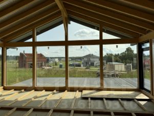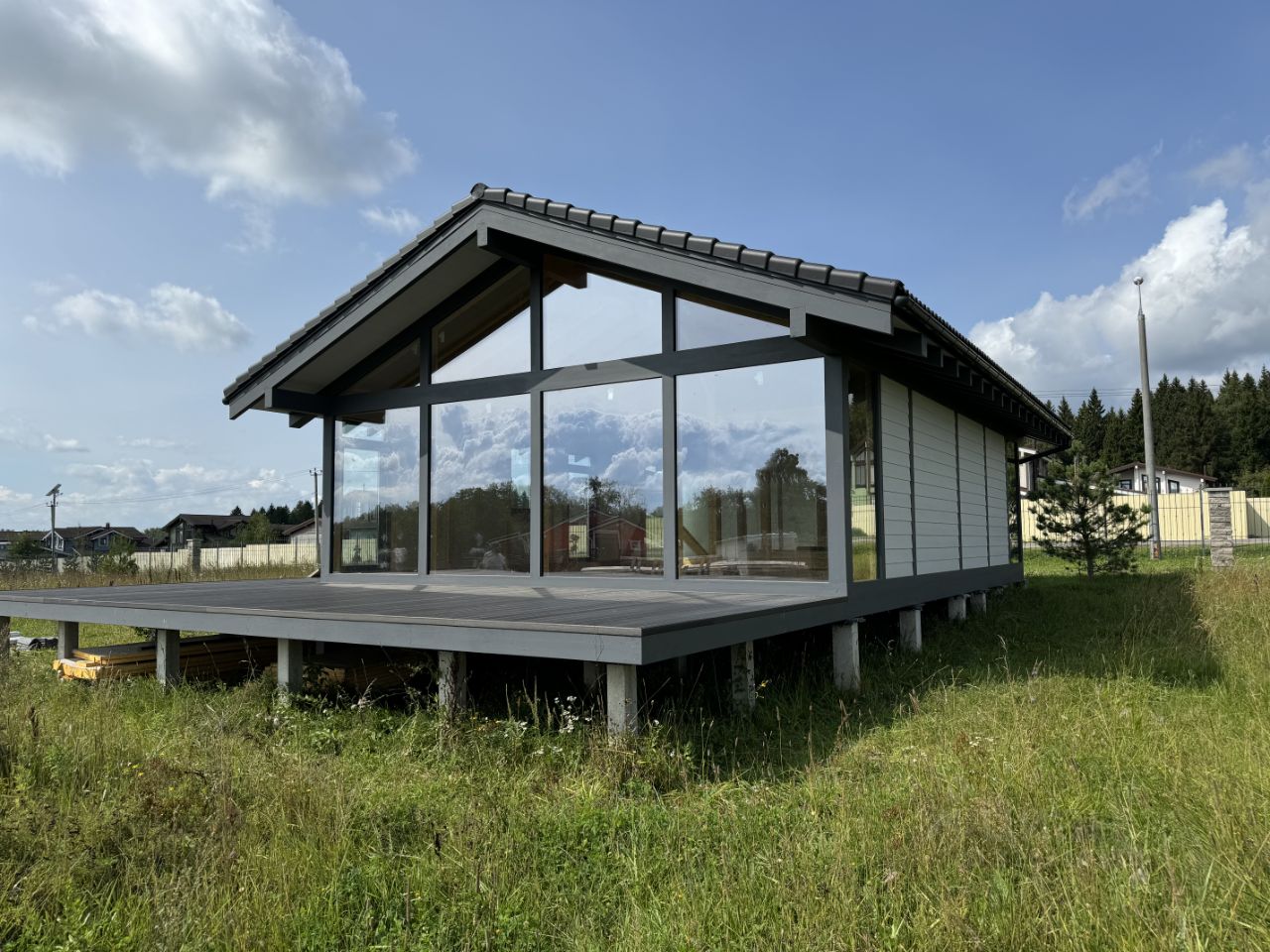 Отделка фасада - фиброцементные плиты, не требующие перекрашивания, клееный брус защищен колерованным маслом G-Nаtutrе в два слоя.