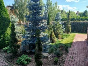 На участке с ландшафтным дизайном аккуратно уложен газон, сделаны дорожки и высажены деревья. Предусмотрена дренажная система.