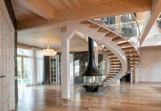 — 1 этаж: прихожая с гардеробными, кухня с кладовой, столовая, гостиная со вторым светом, 2 спальни, санузел, каминная, котельная, терраса