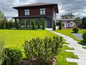 Участок с готовым ландшафтным дизайном с множеством хвойных деревьев - крупномеров, шикарным еврогазоном и АВТОПОЛИВОМ. Ландшафтная подсветка.