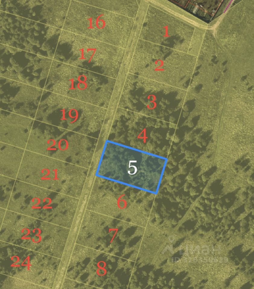 Участок 5 на карте. Соседи — только слева и справа, сзади — тишина и простор. Возможна продажа соседних участков 4 или 6 (там ещё больше елей) или покупка трех участков сразу.