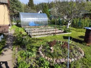 Участок ровный, обработанный (грядки с дорожками), много плодовых и декоративных деревьев, цветов, высажены кусты смородины, крыжовника, малины.