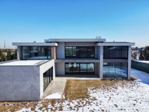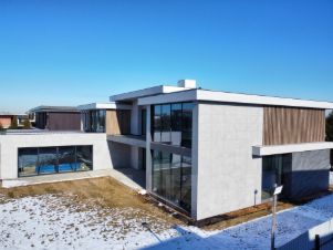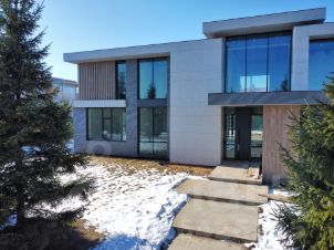Этот дом выделяется элегантной архитектурой с панорамными окнами и натуральной каменной облицовкой, придающей ему особый шарм.