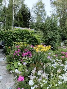 Плодородная земля на дачном участке радует цветением многолетних растений и кустарников с ранней весны до поздней осени: яблоневые деревья, смородина, малина, ежевика, калина, черный виноград и т.д.