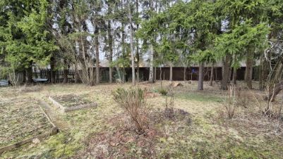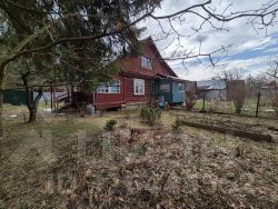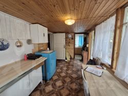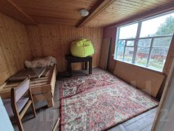 С краю участка есть часть дома из бревна, на ленточном фундаменте. Занимает малую часть участка, можно использовать как дачу, не вкладывая более денег, или при постройке своего дома, использовать как гостевой дом например. Первый этаж терраса-кухня, спальня, комната с печкой, сан/узел. На мансардном этаже спальня (лестницы крутовата, но для молодых не проблема). Дом на двух хозяев, у нас полностью автономная изолированная часть с отдельным входом и коммуникациями.