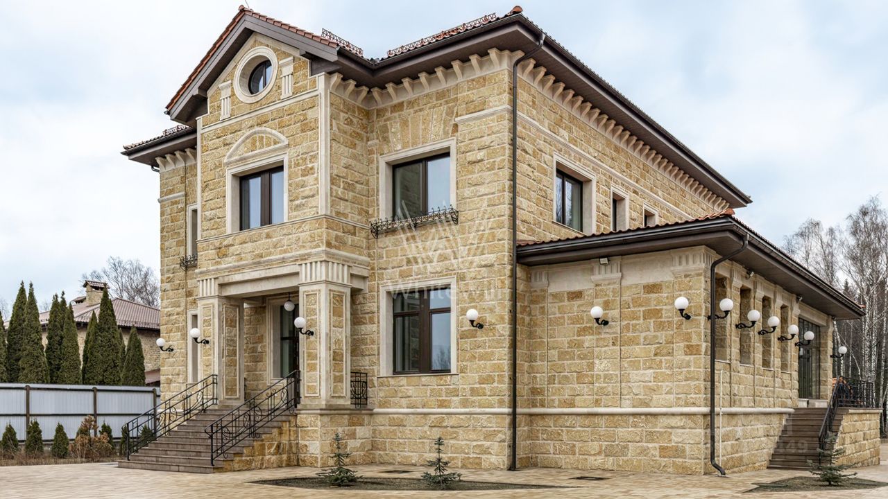 Здания спроектированы в едином классическом стиле, в отделке использован кирпич теплого песочного оттенка. Окна с темными рамами обрамлены наличниками, подчеркивающими строгость и симметрию архитектуры. Центральный вход выделяется массивным портиком с колоннами, органично вписывающимися в общую композицию. Фронтон украшен лепниной, а красная черепичная крыша эффектно контрастирует с основным тоном, завершая гармоничный облик.