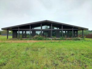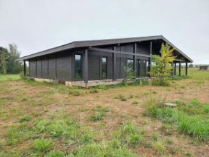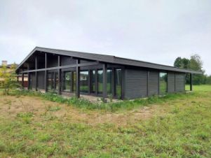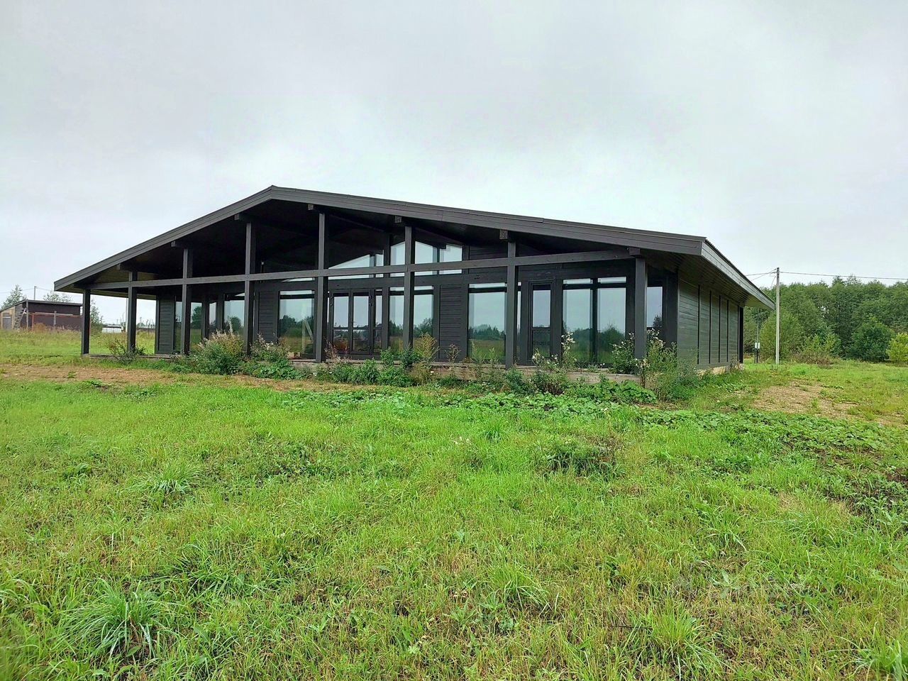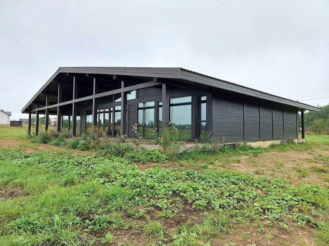 Коттедж построен по стоечно-балочной технологии (аналог технологии Фахверк), обладает энергоэффективными характеристиками, на монолитной железобетонной плите, имеет две огромные террасы во всю длину строения с разных сторон дома. Дом имеет большую площадь остекления с окнами в пол. 7 изолированных помещений, каждое помещение имеет собственный выход на террасы. Террасы находятся полностью под свесами кровли.