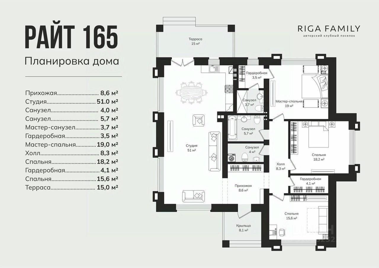 - Мастер-спальня с гардеробом и санузлом;