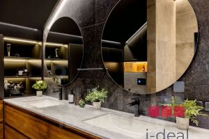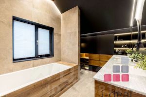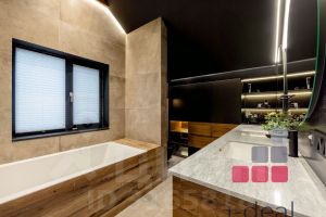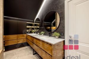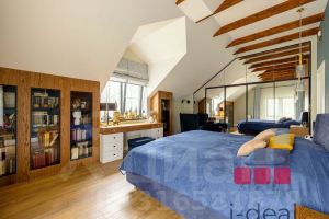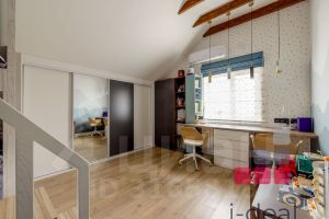 На втором этаже большая хозяйская спальня, детская на 2-х детей с двухъярусной кроватью и рабочими зонами, гардеробная комната, санузел на 2 раковины, туалет и ванная. И кабинет (он не меблирован, можно сделать "под себя")..