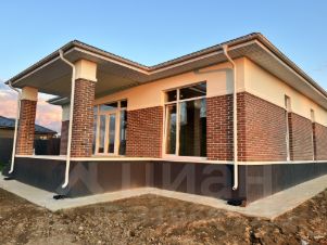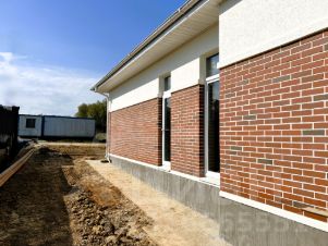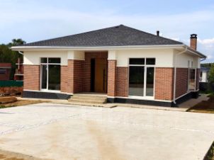 Построен из пеноблока и облицован керамическим (очень красивым) кирпичом.