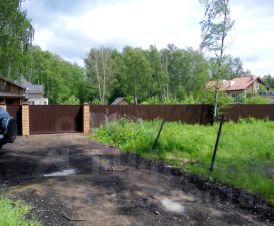 На участке имеются деревья, в т.ч. садовые. Также имеется электричество (15 кВт), водоотведение, канализация, а также газ по границе. При въезде ворота открываются с пульта. Перед участком много места для паковки и личного транспорта.