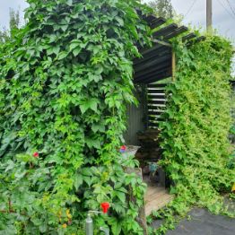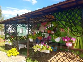 Изюминкой участка является зона отдыха вместительная беседка для вечерних посиделок, она сделана из железного профиля.