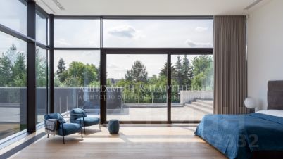 В доме спланирована гостиная с камином, кухня, столовая, 8 спален с ванными комнатами, 5 гардеробных, игровая комната, SPA-зона с сауной. Из панорамных окон открывается потрясающий вид на парк.