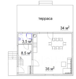 1 этаж: площадь 48 м2, кухня-гостиная с выходом на открытую террасу, обеденная зона, полноценный санузел (душевая кабинка, раковина, унитаз), зона отдыха. На кухне имеется газовая плита, холодильник, стиральная машинка.