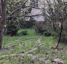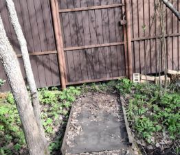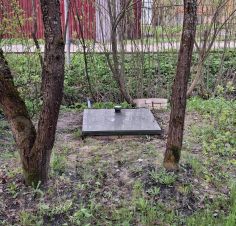 На участке растут хвойные и фруктовые деревья. Проложены дорожки из плитки. Есть бытовка и колодец.