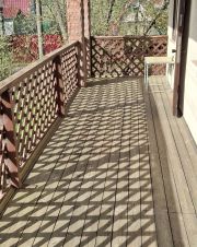 На втором этаже большой балкон (длина - вдоль всей стены, ширина 1.5 м). Есть гараж в котором свободно размещается большая машина (5х2,5х1.75 м) и еще остается много места для размещения инструментов и садового инвентаря.