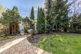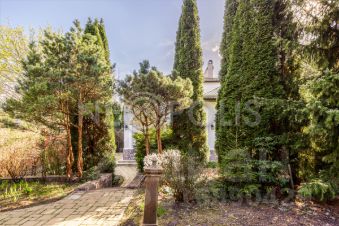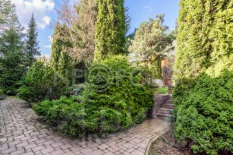 Дорожки на участке вымощены брусчаткой, смонтировано уличное освещение, установлена система "умного полива" с датчиками влажности (можно управлять через приложение).