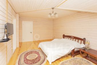 На участке расположена баня-сауна из оцилиндрованного бруса с гостевым домиком. Парная отделана липой, установлена печь Gefest. Есть душевая и санузел.