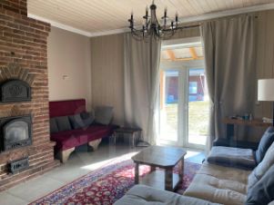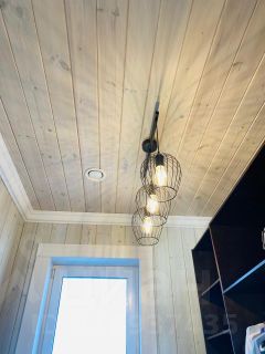 В доме две спальные комнаты, гардеробная, бойлерная, совмещенный санузел, кухня с гостиной с выходом на террасу. По всей площади дома и бани водяной теплый пол. Толщина стяжки теплого пола 14 см. На полу плитка керамогранит. Печь камин из кирпича ручной формовки. Очень теплоемкая и энергоэффективная. Печь делал опытный печник во втором поколении. Внутри дома частично стены обшиты имитацией бруса и частично штукатуркой. Окна пластиковые хауберг. Входная дверь уличная зимняя с терморазрывом.