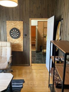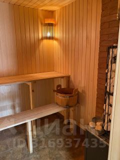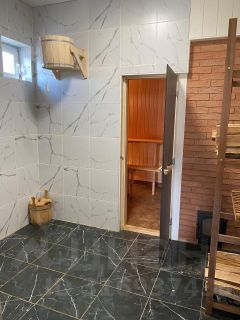 Баня. Вход в баню через террасу. Баня состоит из трех зон: комната отдыха с кожаным диваном и журнальным столиком, душевая комната с теплым полом, с отдельным бойлером на 80 литров и обливным ведром, парная с полками в два яруса. Печь Везувий чугунная на дровах. Обшивка стен