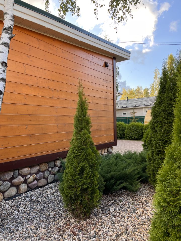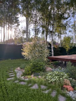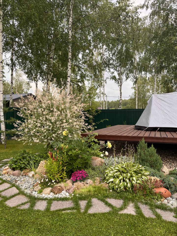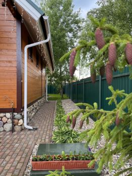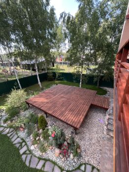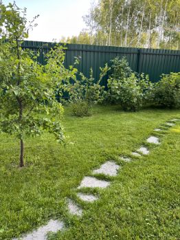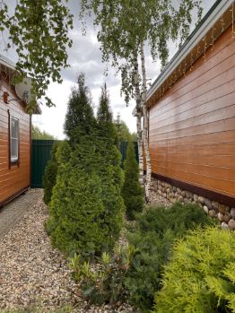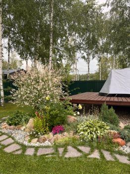 Установлены две теплицы, высокие грядки, альпийский рокарий, высажены туи, ели, сосны, плодовые деревья, кустарники, цветы, посажена газонная трава.