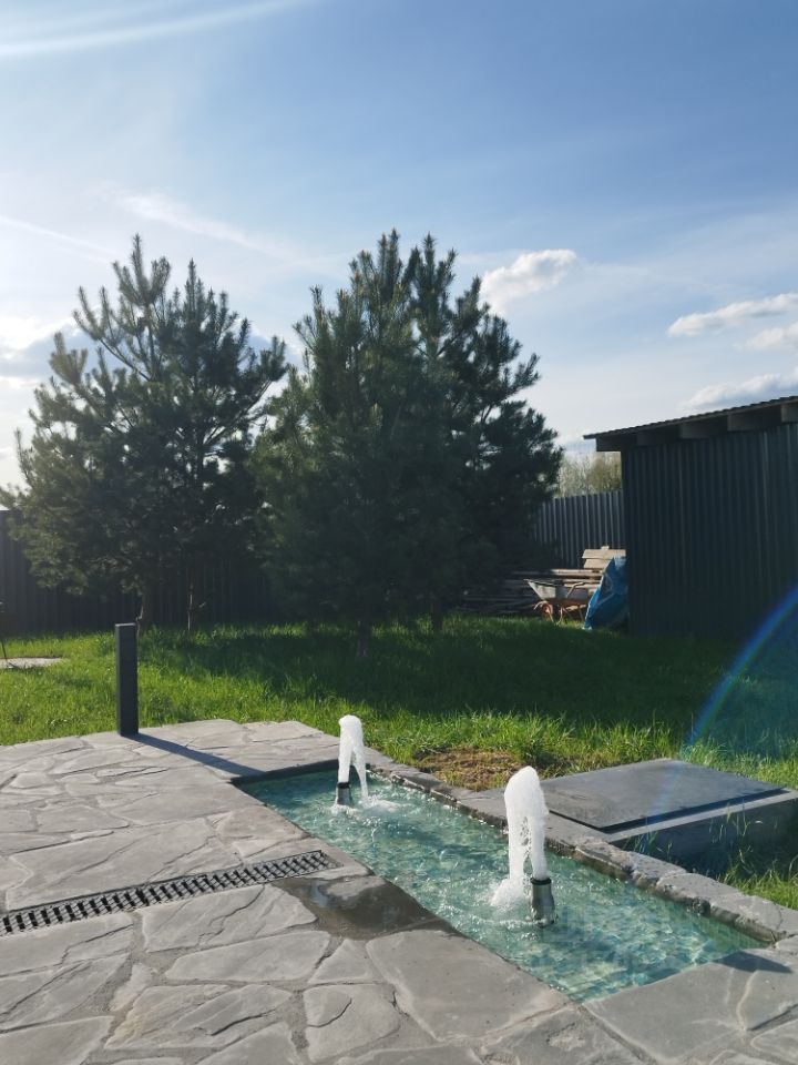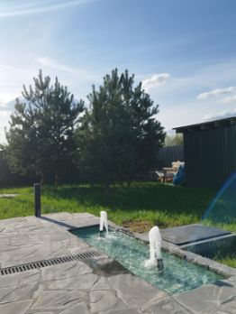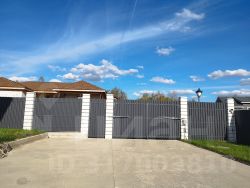 На участке площадка для парковки 4 авто, зеленый газон. По периметру дома и всего участка — дренажная система. Ворота на пульте управления.