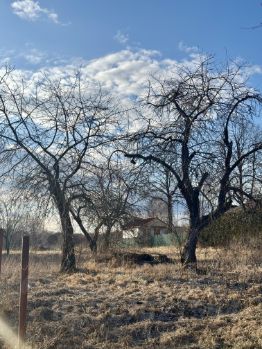 На участке имеются старинные яблони, сирень, вдоль соседского забора - живая изгородь из туй.